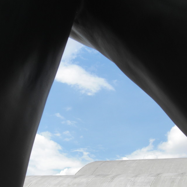 The roof of Oscar Niemeyer’s Simon Bolivar auditorium seen through the legs of ‘Torso Negra’ by Villa, Memorial da America Latina, Sao Paulo.