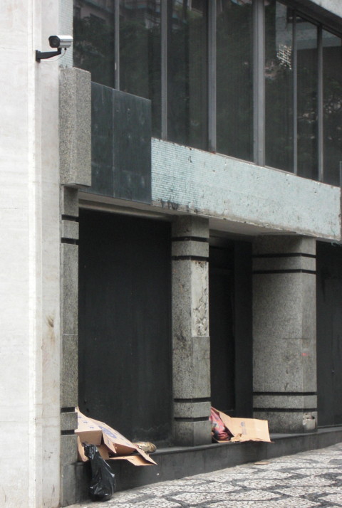 Previous Image Next Image homelesscam1 homeless2 Homeless men sleep in windows, as a surveillance camera watches over the doorway.