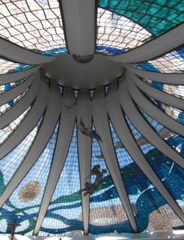 Interior view of he beautiful roof of the cathedral in Brasilia. Unfortunately there is quite a bit of damage to the complex stained-glass design, but the overall effect is still both awesome and calming.
