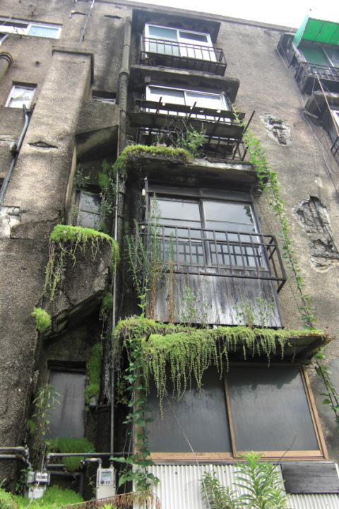 Previous Image Next Image doj_view2 Facade 2 Looking up at the wooden window casements, overgrown by moss and ivy