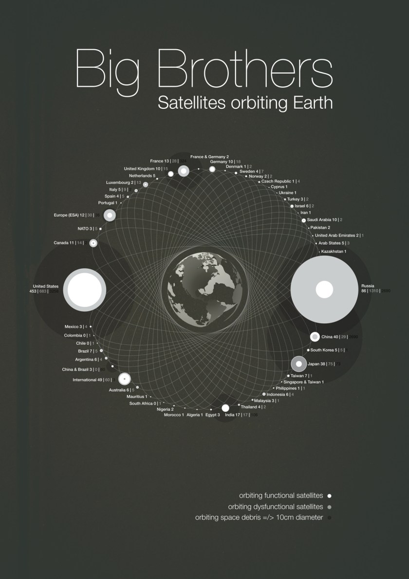 A great graphic from Michael Paukner on Flickr of all the world’s satellites, working and defunct, plus debris, by country. Interestingly, China and France appear to the worst litterers of space as a proportion of the amount of stuff they have up there. Russia have the most out of commission satellites and the USA (not surprisingly) have the most working devices. Of course, this graphic doesn’t distinguish civil from military, nor say what are their functions, but the sheer amount of stuff in orbit indicates why there will be serious conflict over the use of orbital space soon enough…