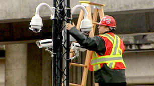 A city worker installs video surveillance cameras outside GM Place in downtown Vancouver. (CBC)